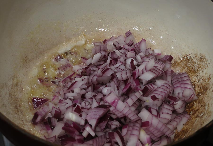 Place the butter in a medium-sized enamel pot over medium heat. When the butter melts, add the onion and saute them for about 5 minutes, without any extreme browning.