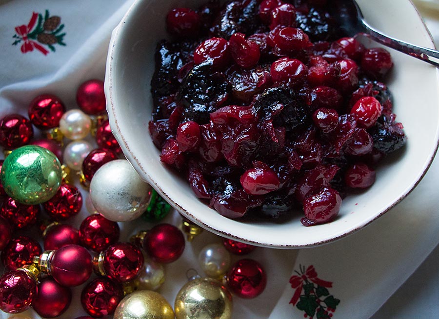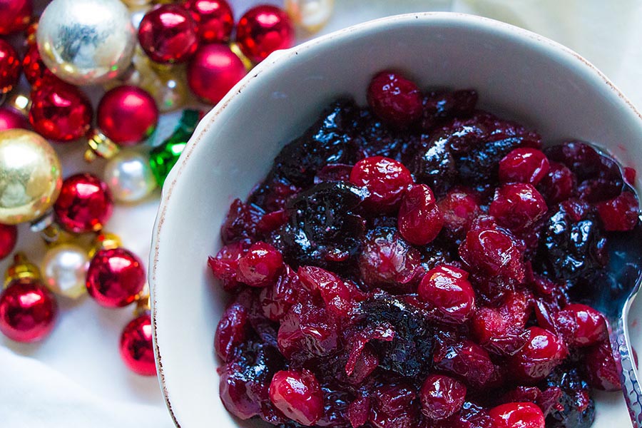 note: Instead of port or just water, which was in the original recipe, consider using a liqueur, like an orange liqueur, or just orange juice or pomegranate juice. It all works to help plump up the cherries and cook the cranberries. Orange zest could be included in this recipe as well.