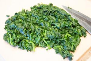 Meanwhile, heat a medium saucepan over medium-high. Add spinach, 1 handful at a time; cook, stirring often, until wilted, 2 to 3 minutes. Transfer spinach to a fine wire-mesh strainer; let drain and cool for about 20 minutes. Wipe saucepan clean. Squeeze spinach with a clean kitchen towel to remove as much liquid as possible; coarsely chop and set aside.