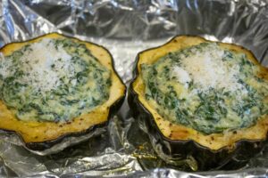 Spoon evenly divided spinach mixture into squash halves; sprinkle with remaining 1/4 cup Parmesan. Bake at 475°F until Parmesan is melted and beginning to brown, 5 to 8 minutes.