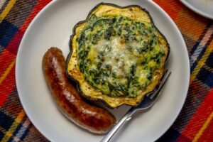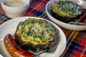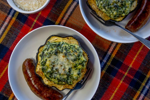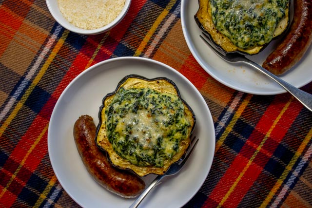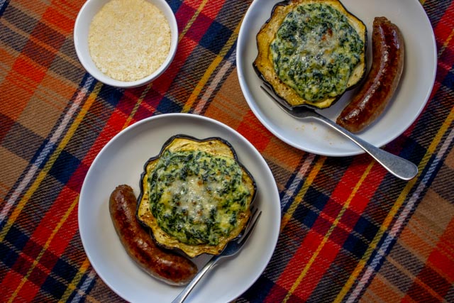 This vegetable side dish is such a simple idea, but wow is it delicious! It’s creamed spinach placed inside acorn squash halves, from Food & Wine. But there’s a chef’s twist.