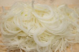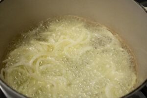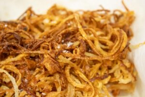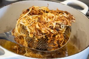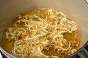 Heat the sunflower oil in a medium heavy-bottomed saucepan placed over high heat. Make sure the oil is hot by throwing in a mall piece of onion; it should sizzle vigorously. Reduce the heat to medium-high and carefully add one third of the sliced onion. Fry for 5 to 7 minutes, stirring occasionally with a slotted spoon, until the onion takes on a nice golden brown color and turns crispy (adjust the temperature so the onion doesn’t fry too quickly and burn). Use the spoon to transfer the onion to a colander lined with paper towels and sprinkle with a little more salt. Do the same with the other two batches of onion; add a little extra oil if needed.