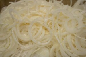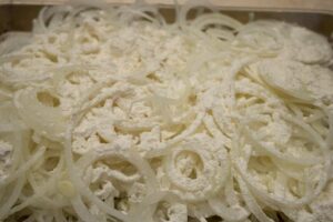 Peel the onions and slice thinly. Place on a large flat plate, prickle with the flour and 1 teaspoon salt, and mix well with your hands.
