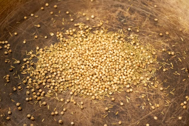 Wipe the saucepan in which you fried the onion clean and put in the cumin and coriander seeds. Place over medium heat and toast the seeds for a minute or two.