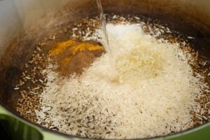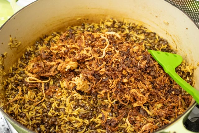 Finally, add half the fried onion to the rice and lentils and stir gently with a fork.
