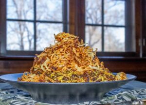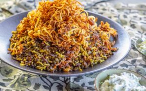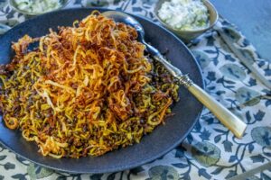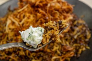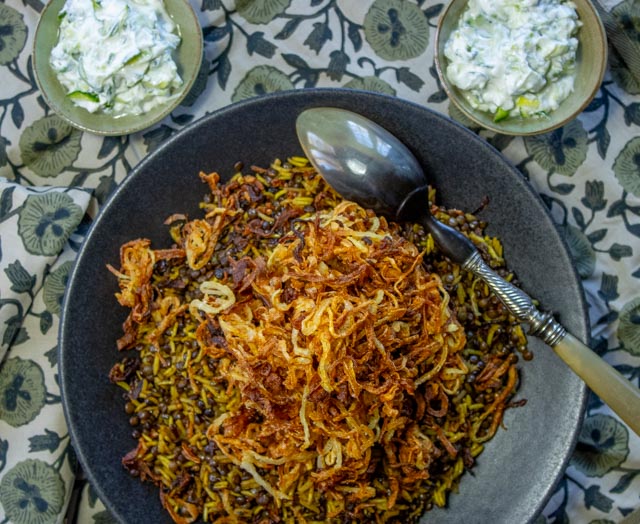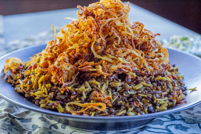 The recipe is for Mejadra, an ancient dish, popular throughout the Arab world. It’s a lentil and rice dish with onions and aromatic spices.