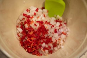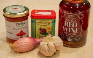 Mix the vinegar with the minced garlic, shallot, hot pepper and roasted red pepper and let this sit for 10 minutes or so to mellow out.