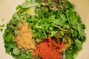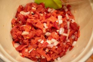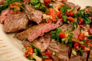 Shaw recommends chopping everything by hand, otherwise the chimichurri will turn a strange color. I think we’ve all learned with paints that red and green don’t blend together well!