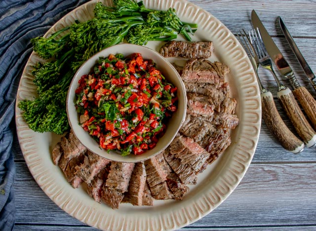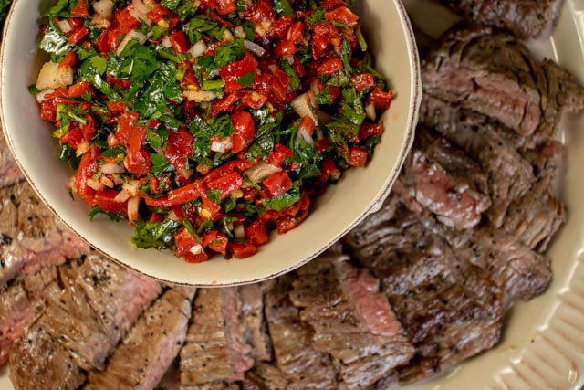 I love me some red chimichurri! And you are very good to give the advice not to blitz us in the food processor. We did that, and the result was rather brown looking… Hand chopping is the way to go!
