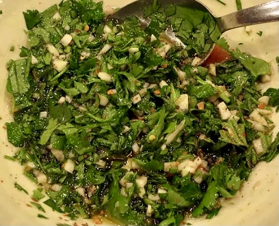 When my husband and I visited Argentina in 2019, I was served the well known green chimichurri in restaurants, as well as a red version. Yet I kept forgetting to look it up. Here’s what the traditional green looks like.