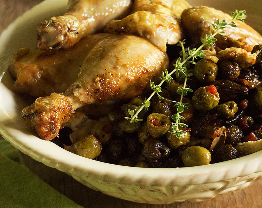 When I was in France recently, visiting Stéphane from the blog My French Heaven, he made my girlfriend and I a roasted chicken dish that I’m still dreaming about. It’s officially called Tangy Green Olive Chicken, and the recipe is on his blog here. It’s one of those simple peasant dishes that just screams with flavor. Because he’s already posted on this dish, but I wanted to make it myself.