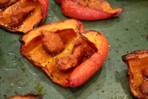 Break the ‘nduja into chunks and divide it among the peppers, putting it inside them. Roast for a final 10 minutes.