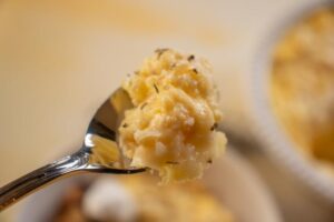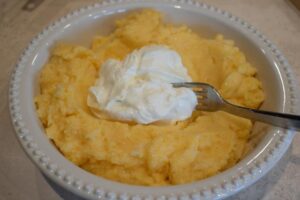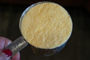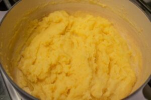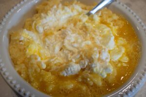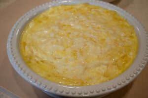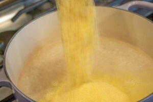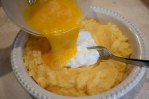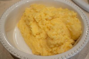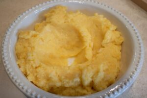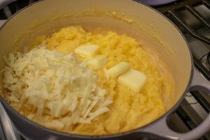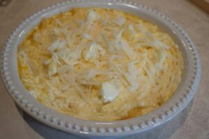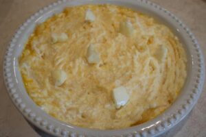 Stir in the butter and cheese, then pour the cornmeal into a 9 inch ceramic baking dish. Allow it to cool a little.
