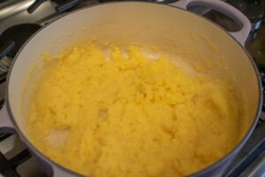 From the book I chose to make Mămăligă la Cuptor. Mămăligă translates to polenta or cornmeal, and la cuptor translates to “in the oven.” That describes the dish well. This cornmeal porridge starts on the stove with cheese, but unlike Italian polenta, it is then poured into a baking dish; eggs and sour cream are stirred in before going in the oven.
