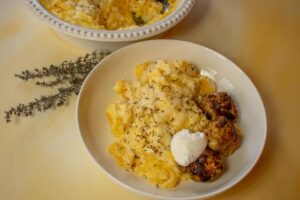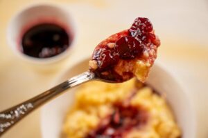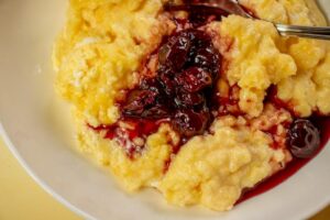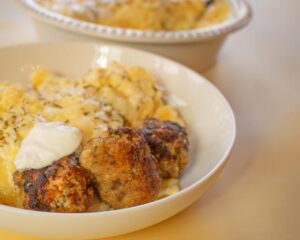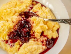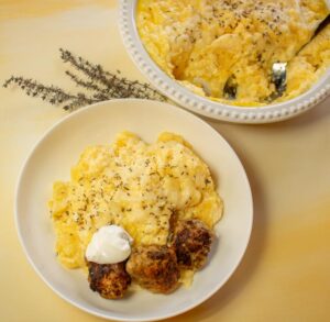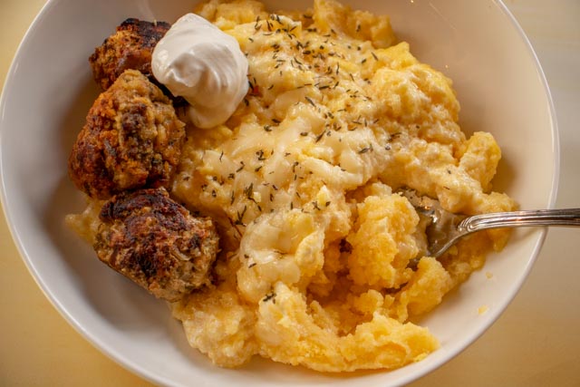 This cornmeal porridge is also eaten for breakfast, typically with jam and sour cream. For the lunch or dinner version I’ve included savory meatballs. Other options are sausages, eggs, or even beans. And always sour cream!
