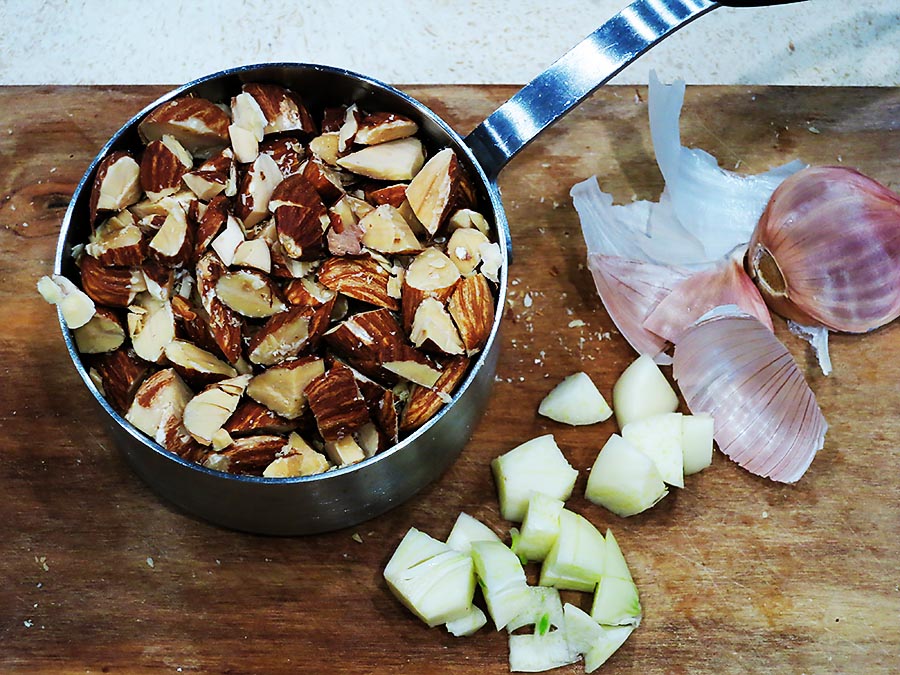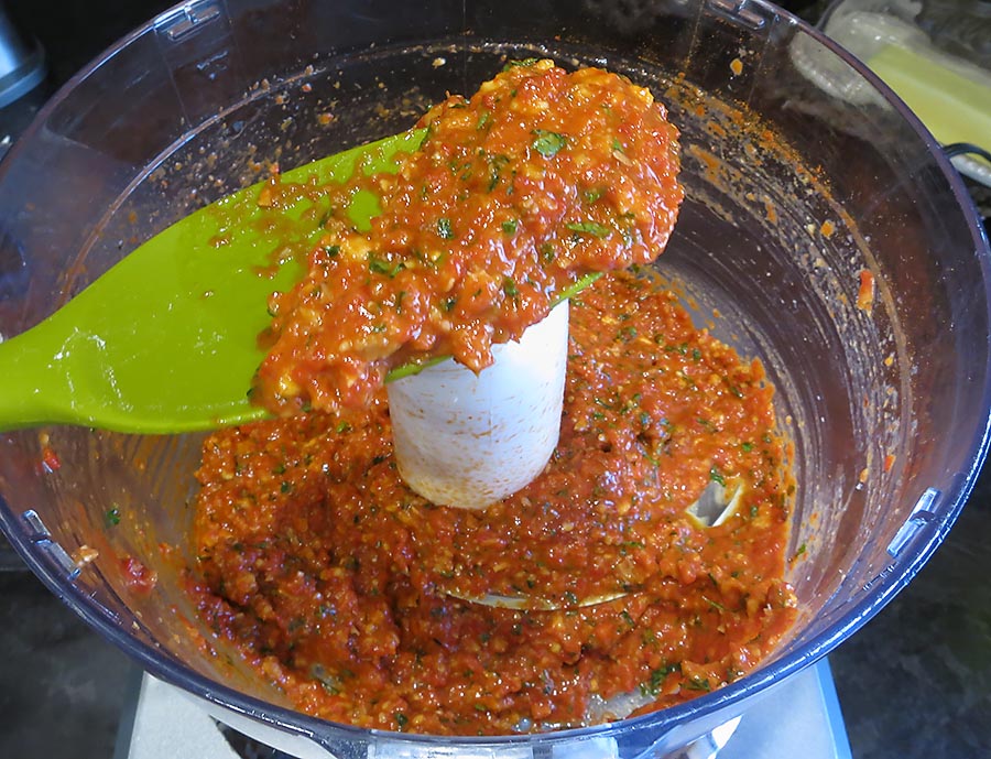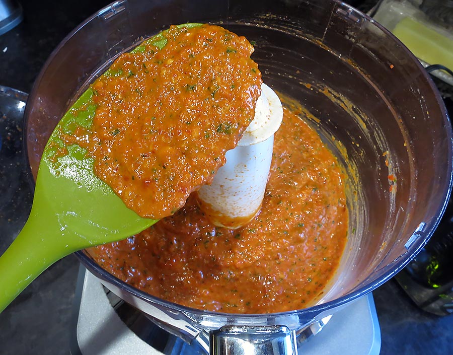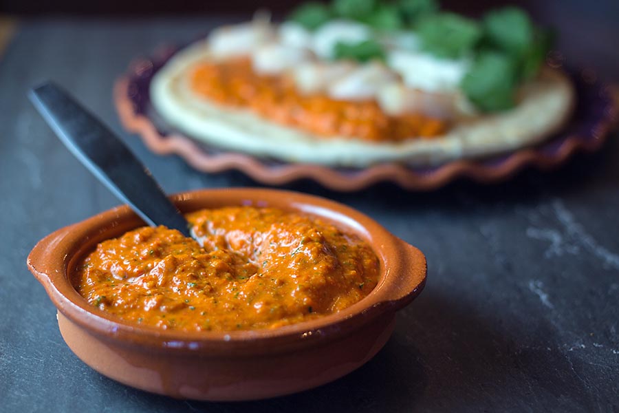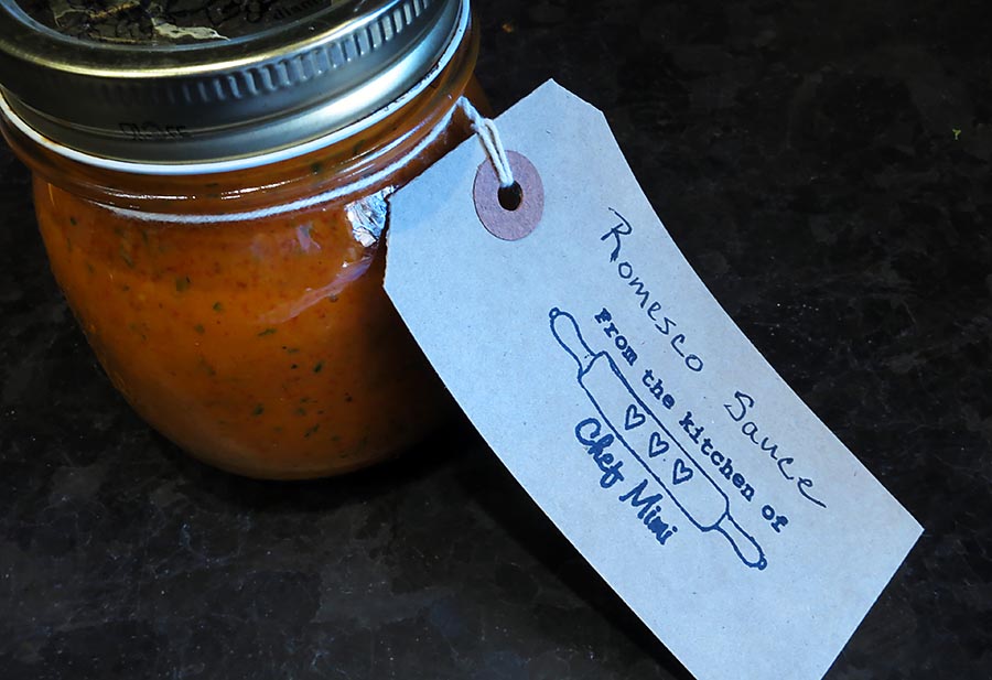 You see, I can remember Ro-mesco, because it reminds me to think of Ro-asted red bell peppers. And that’s exactly what this sauce is. The base, at least, is roasted red bell peppers. It’s extremely easy to make. In fact, you can use jarred roasted red bell peppers instead of roasting your own.