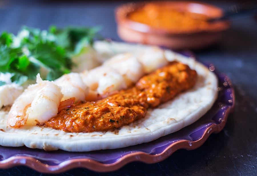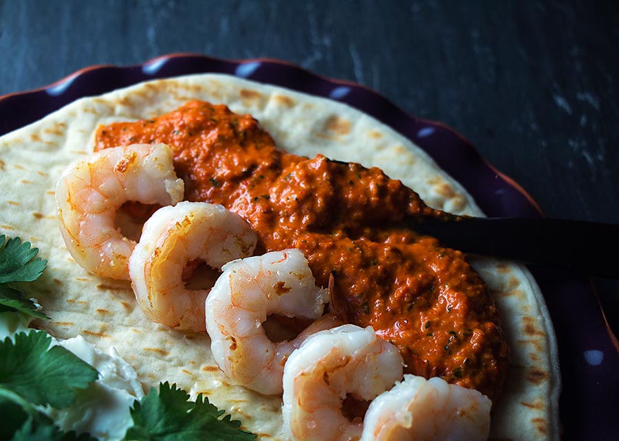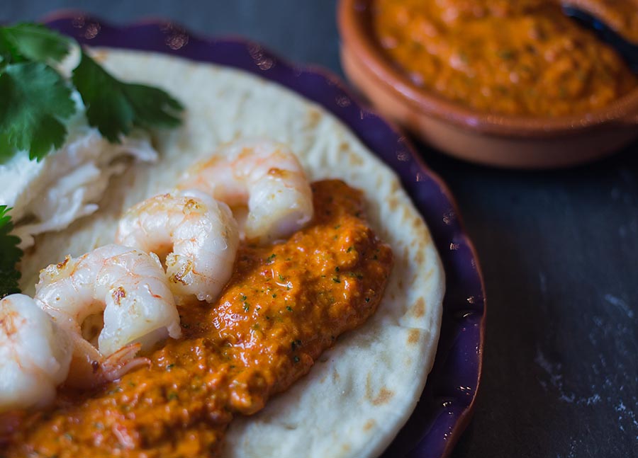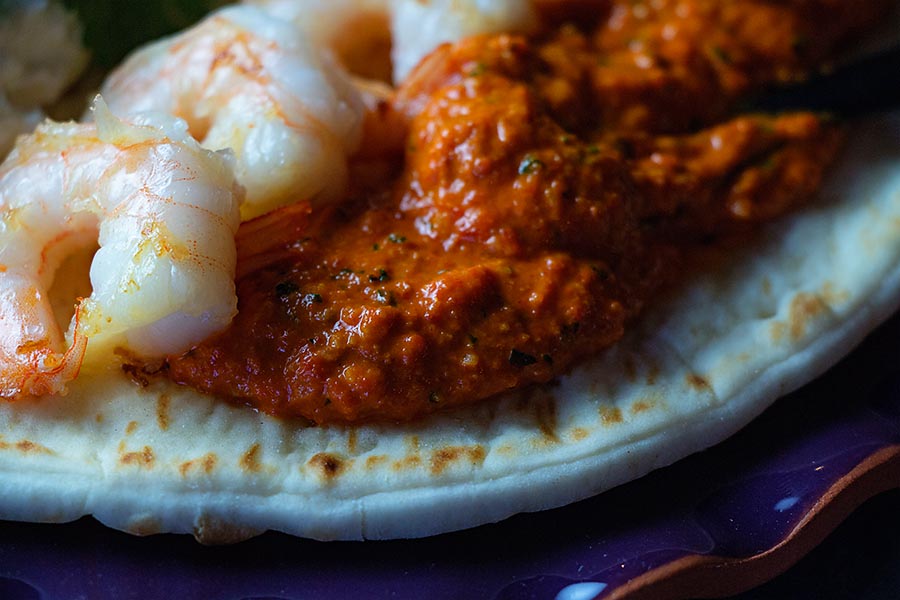 I chose to make a Mediterranean-inspired lunch using the Romesco spread on a flatbread, and with grilled shrimp placed on top.