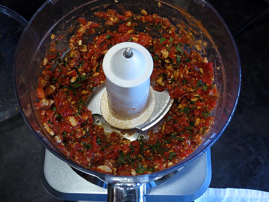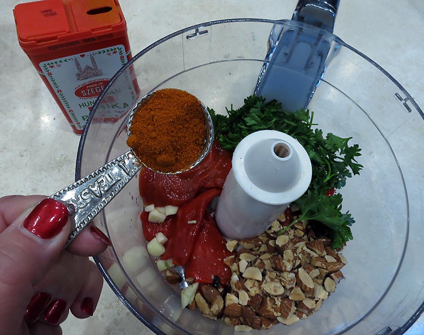 Place the drained red bell peppers in a jar of a food processor. Add the almonds, garlic, tomato purée, parsley, and red wine vinegar. Then add the hot paprika, cayenne pepper, and salt.