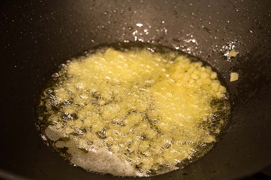 In a 10″ karhai or heavy skillet or a 12″ wok heat the ghee over moderate heat until a drop of cold water flicked into it sputters instantly.