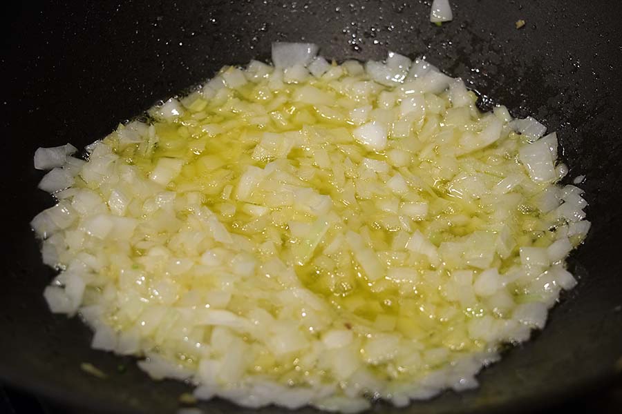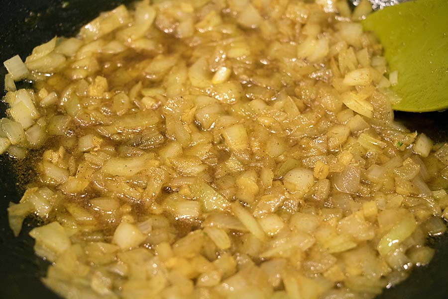 Add the ginger and fry for 1 minute. Add the onions and salt and continue to fry, lifting and turning the mixture constantly, for 7 to 8 minutes, or until the onions are soft and golden brown.