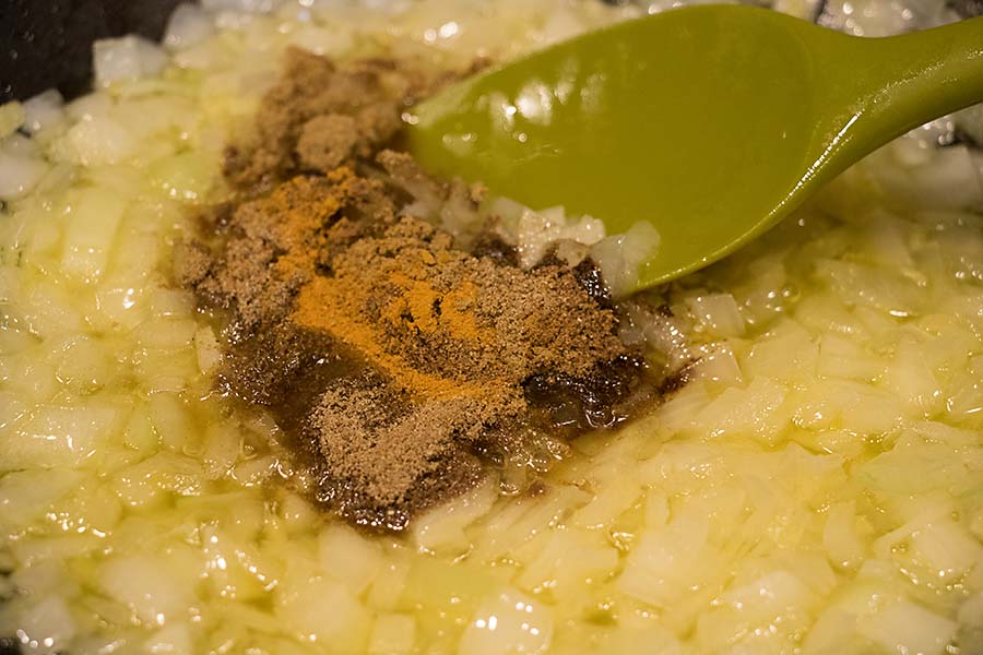 Stirring after each addition, add the cumin, turmeric, coriander and garam masala.