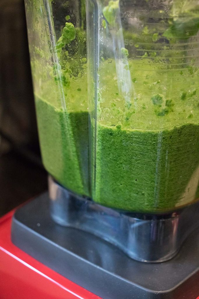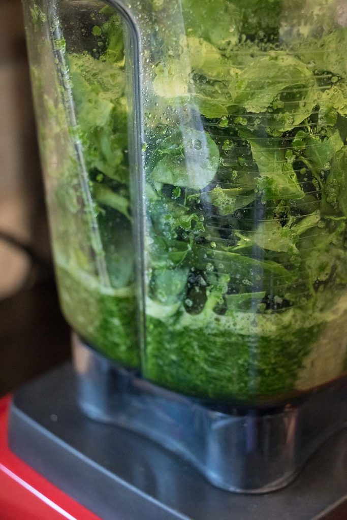 Turn the machine off and scrape down the sides of the jar with a rubber spatula. Then add another handful of spinach, purée for 30 seconds and stop the machine again. Repeat until all the spinach has been puréed. Transfer the spinach to a bowl, and pour the remaining 1/2 cup of water into the blender jar.