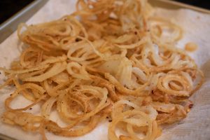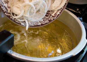 Line a baking sheet with a layer of paper towels. In a heavy pot or a cast-iron frying pan over medium-high heat, warm the oil until it registers 320 degrees to 340 degrees on an instant-read thermometer. (I used my electric deep fryer.) When the oil is at the correct temperature, dredge 1/4 of the onion rings in the flour mixture, shaking off any excess before transferring to the hot oil. Fry until golden brown, 1 to 2 minutes, then transfer to the prepared baking sheet. Repeat with the remaining onions, working in batches.