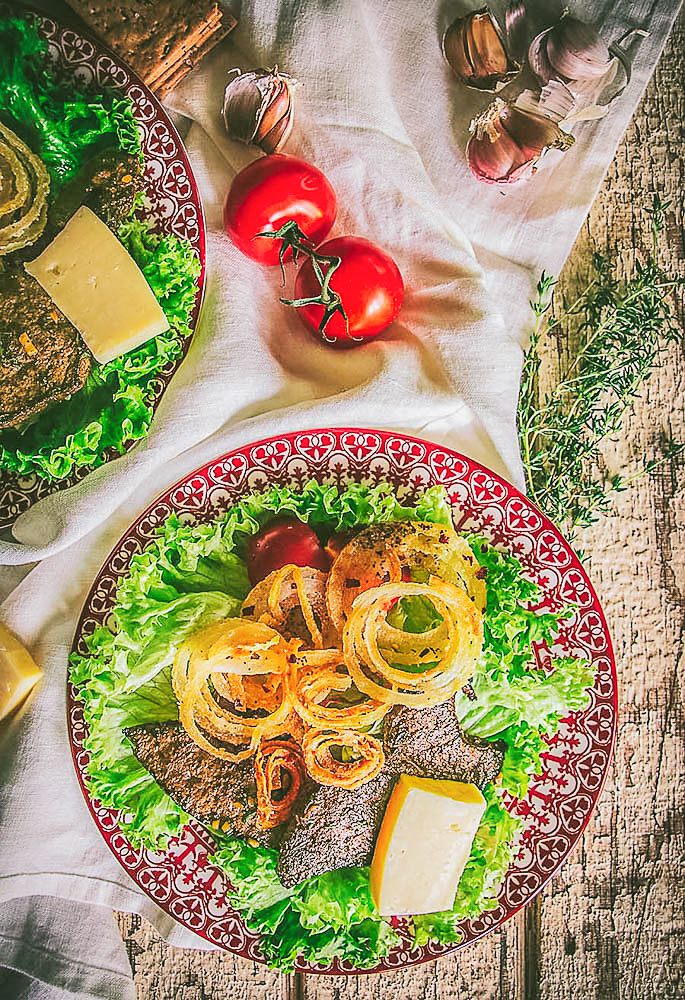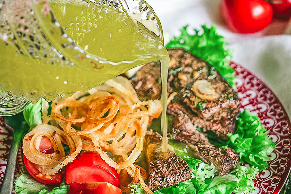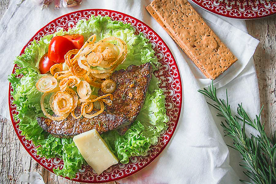 When I purchased the book, Alpine Cooking, I knew all of the cheesy recipes would jump out at me, like liptauer. What I didn’t expect to entice me was a beautiful green salad topped with sautéed calf liver and fried onions.